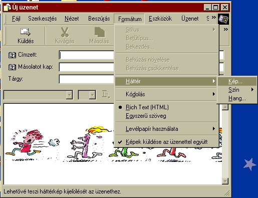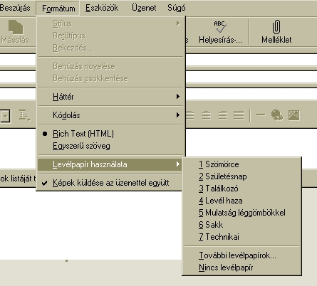 A Szín és a Hang menüpontok segítségével tetszőlegesen színezhetjük a levélpapírt, továbbá hangállományt csatolva "hangos" levelet is küldhetünk |